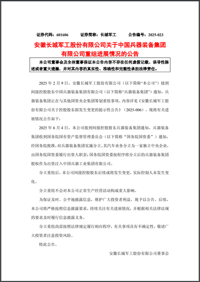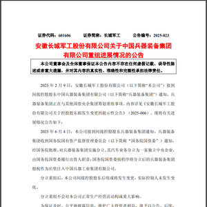 此前,上述公司曾于2025年2月9日晚公告,兵器装备集团正在与其他国资央企集团筹划重组事项。本次重组或将导致公司控股股东发生变更,但不会导致实际控制人发生变更。这意味着此前业界盛传的“东风系”与“长安系”重整并未落地。