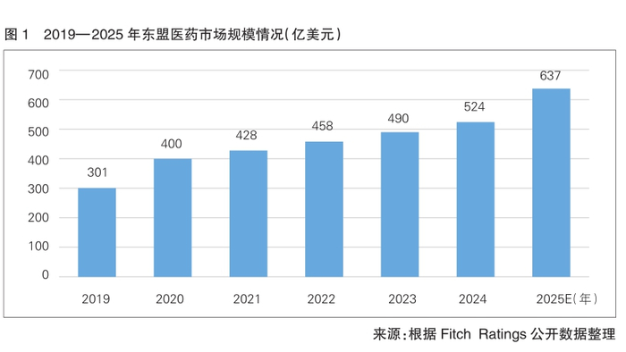 根据Fitch Ratings公开数据,东盟医药市场规模已由2019年的约301亿美元增至2024年的约524亿美元,预计2025年突破600亿美元大关,增至637亿美元(详见图1)。根据Statista统计数据,2024年东盟处方药市场规模约为13.42亿美元,预计2029年将增至16.05亿美元,年复合增长率3.64%。