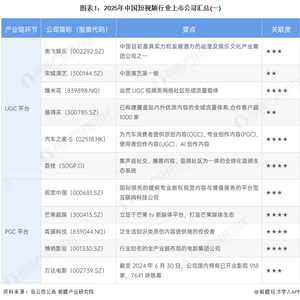 上游UGC平台:奥飞娱乐(002292.SZ);宋城演艺(300144.SZ);爆米花(839898.OC);值得买(300785.SZ);汽车之家-S(02518.HK);荔枝(SOGP.O);PGC平台:视觉中国(000681.SZ);芒果超媒(300413.SZ);青藤文化(839044.OC);年轮映画(871813.OC);博纳影业(001330.SZ);万达电影(002739.SZ);