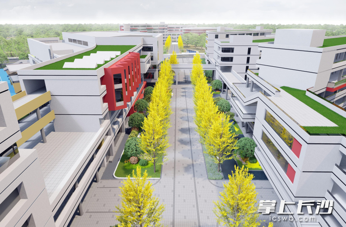 校园的景观中轴,新种植的28棵银杏高大挺拔,形成一条宽阔开敞的视觉通廊。据悉,校园景观设计融合了“七园”理念,种植金丝楠、紫薇等特色植物,形成四季有景的生态环境。在绿轴的两侧,则是容纳“科创+艺术”的育人空间,结合建筑架空层置入丰富的文化展览、课外教学、社团活动、学科竞赛等功能空间,与自然共融,复合共享。整个校区楼栋通过内走廊形式连接,将为学生提供充裕的课后活动空间。