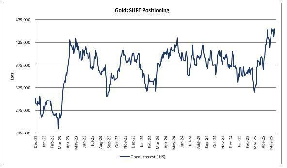 注:浅蓝为金价,深蓝为整体黄金持仓,数据来源:ifind,截至2025.5.25