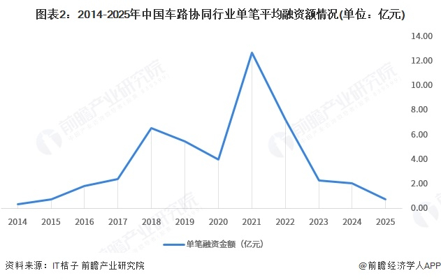 2014-2021年,中国车路协同行业单笔平均投融资金额波动增长,2021年大幅增长至12亿元以上,2024年下降至2.08亿元。