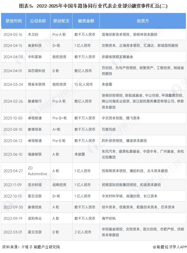 2024年1月22日工业和信息化部、公安部等5部门发布《关于开展智能网联汽车“车路云一体化”应用试点工作的通知》,推动车路协同技术的应用。随着智能交通基础设施等新基建建设的推进,车路协同作为自动驾驶与新基建的交汇点,市场需求将持续增长,投融资事件较多。2022-2025年我国车路协同行业代表企业的部分投融资事件如下: