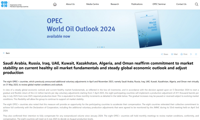 就在部长级会议举行一天之后,2025年5月31日,沙特阿拉伯、俄罗斯等8个欧佩克+自愿减产的国家再次召开线上会议,决定了2025年7月的产量水平。以下,为欧佩克官网公布的这8个国家决议的完整内容: