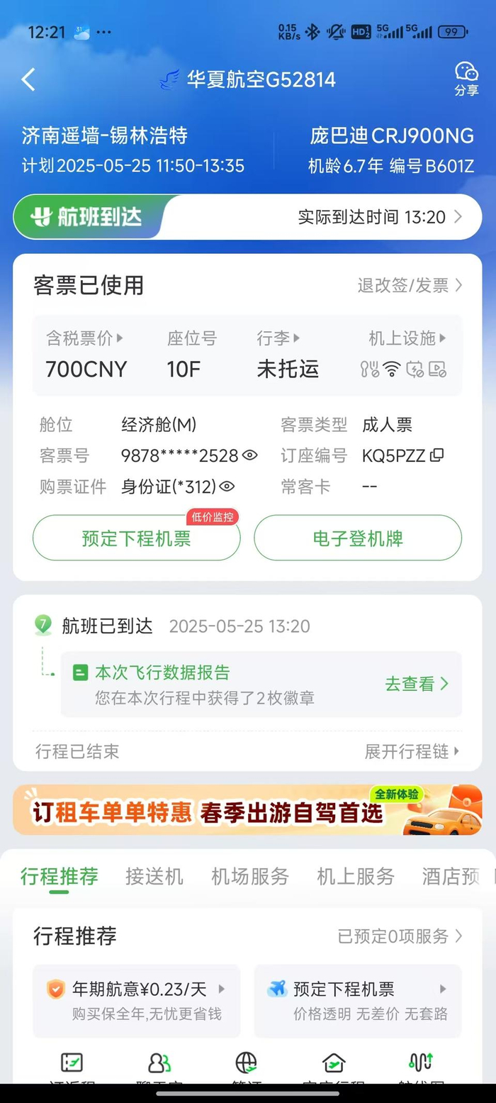 5月25日,韩先生从济南出发乘坐华夏航空G52814前往锡林浩特,5月27日又乘坐华夏航空G54158从锡林浩特前往鄂尔多斯,两段行程均为庞巴迪CRJ900NG飞机。“我平时经常坐飞机出差,但是很少坐支线飞机,第一印象就是这个飞机比平时经常坐的波音跟空客小了一号。”韩先生说,登机后他感觉客舱内部空间略显拥挤,起身的话一不小心就会碰到头。“实话实说没怎么坐过小飞机,刚上飞机的时候还是有一点忐忑。”韩先生说,他查询从济南到锡林浩特的直飞航班只有这一班,如果有其他机型选择他首选还是大飞机。
