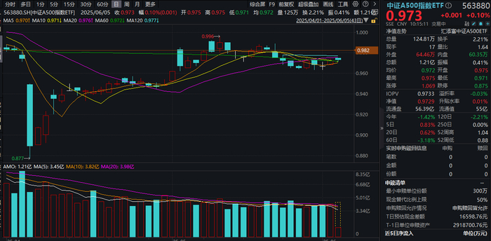 6月5日,A股涨跌不一,中证A500指数ETF(563880)昨天(6.4)全天红盘震荡,收涨0.52%,今日高开后震荡,当前微涨0.1%。