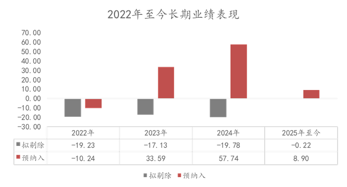 从成分股收益表现来看,自2023年以来,预纳入的成分股平均收益率持续优于拟剔除成分股,长短期收益均亮眼。
