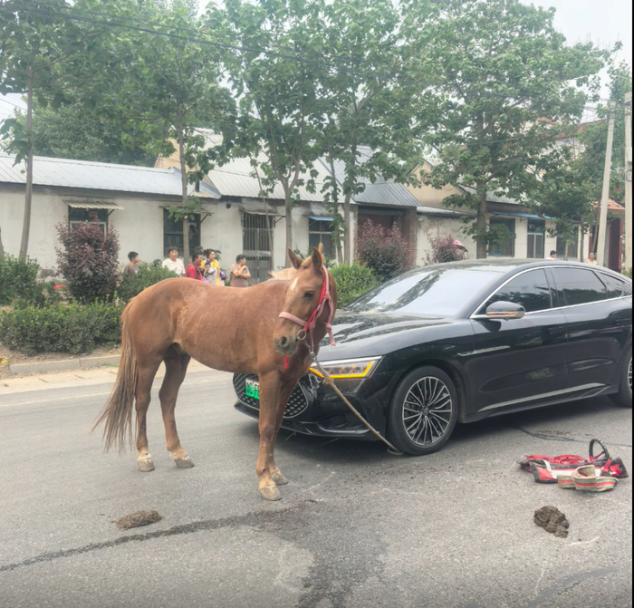 车主称当时自己都懵了,坐在车里久久不能回神。由于马的缰绳被车轮胎压住,一时半会也找不到马的主人,最后只能报警并通知保险公司。