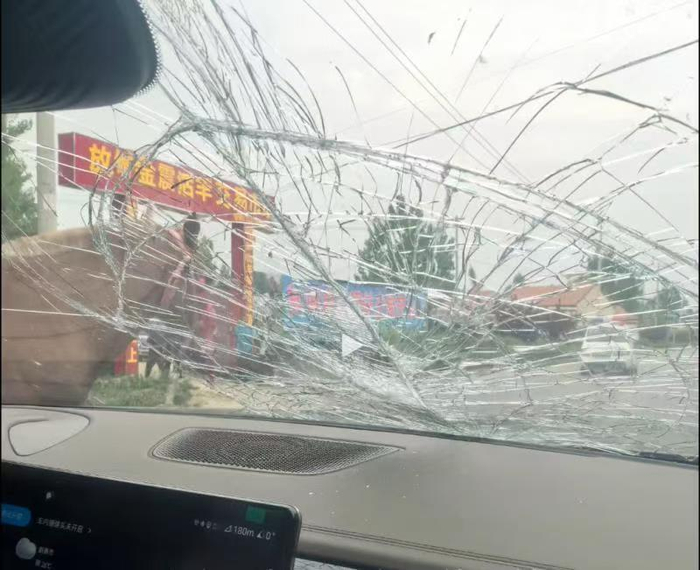 疑似行车记录仪视频显示,6月1日16:31:41,其驾车途经这个交易市场时,一匹马快速奔上前,撞在车头,右前挡风玻璃破裂,破损处还残留有血迹。
