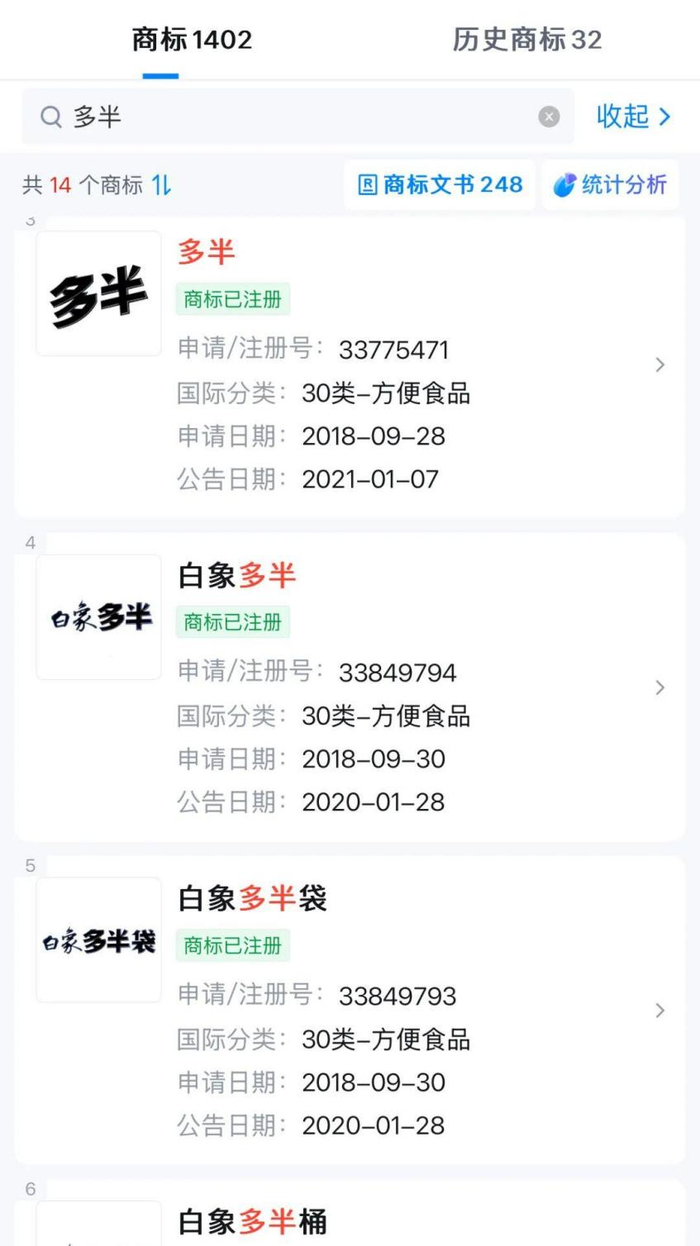 有媒体查询到,与“多半”有关的商标有14个,9个商标无效,5个商标已注册,包括“多半”“白象多半”“白象多半袋”“白象多半桶”。