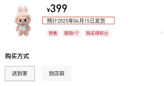 在泡泡玛特小程序搜索该系列产品,购买方式选择“送到家”,页面显示已售罄,预计2025年6月15日发货。