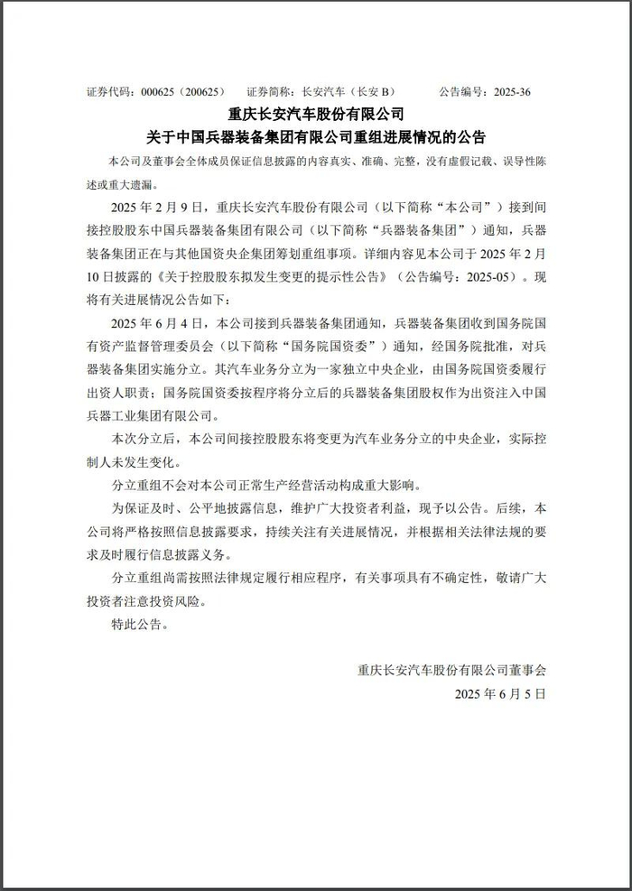 长安汽车公告,2025年6月4日,公司接到兵器装备集团通知,兵器装备集团收到国务院国有资产监督管理委员会通知,经国务院批准,对兵器装备集团实施分立。其汽车业务分立为一家独立中央企业,由国务院国资委履行出资人职责;国务院国资委按程序将分立后的兵器装备集团股权作为出资注入中国兵器工业集团有限公司。本次分立后,公司间接控股股东将变更为汽车业务分立的中央企业,实际控制人未发生变化。分立重组不会对公司正常生产经营活动构成重大影响。