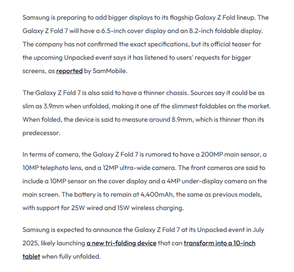 三星Z Fold 7核心配置曝光:3.9毫米机身+4400mAh电池