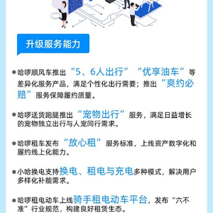 为满足多种场景下的出行需求,哈啰也在持续推动服务能力迭代升级。哈啰顺风车推出“5、6人出行”“优享油车”等差异化产品,并通过“爽约必赔”机制保障服务品质;哈啰送货跑腿业务推出“宠物出行”服务,满足日益增长的宠物独立出行与人宠同行需求;哈啰租车发布“放心租”服务标准,上线资产数字化和履约线上化能力;小哈换电则支持换电、租电与充电多种模式,解决用户多样化补能需求;哈啰租电动车上线骑手租电动车平台,发布“六不准”行业规范,助力城市即时配送行业健康有序发展。