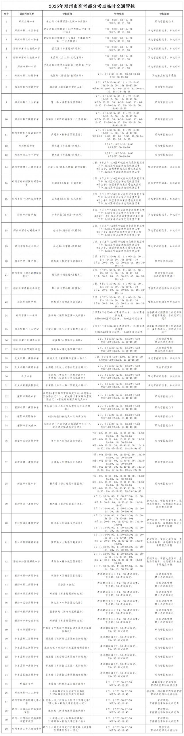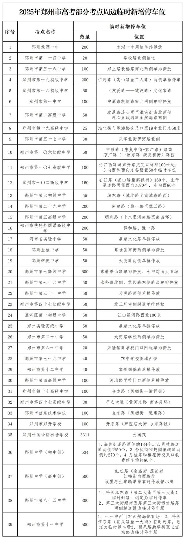 据悉,部分考点周边由于道路狭窄,停车位少,考生和送考家长众多,停车需求大,交通压力较大。为确保考点周边道路畅通,郑州交警经过调研梳理,对全市39个考点周边新增8535个临时停车位,将对60个考点门前道路采取禁行、限行等临时性交通管理措施,具体信息如下: