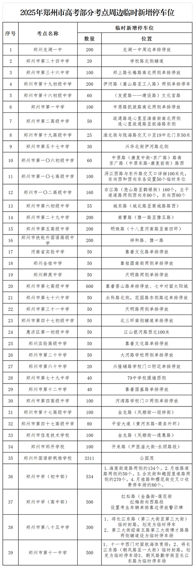 据悉,部分考点周边由于道路狭窄,停车位少,考生和送考家长众多,停车需求大,交通压力较大。为确保考点周边道路畅通,郑州交警经过调研梳理,对全市39个考点周边新增8535个临时停车位,将对60个考点门前道路采取禁行、限行等临时性交通管理措施,具体信息如下: