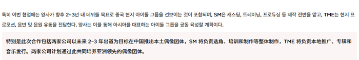 2)2.0版的EXO要来了?5月末,HYBE刚刚官宣在北京成立分公司HYBE CHINA,将聚焦协助旗下艺人来华活动。而在SM官网上,SM表示两家公司以未来 2~3 年出道为目标在中国推出本土偶像团体,SM 将负责选角、培训和制作等整体制作,TME 将负责本地推广、专辑和音乐发行。两家公司计划通过此共同培养亚洲领先的偶像团体。