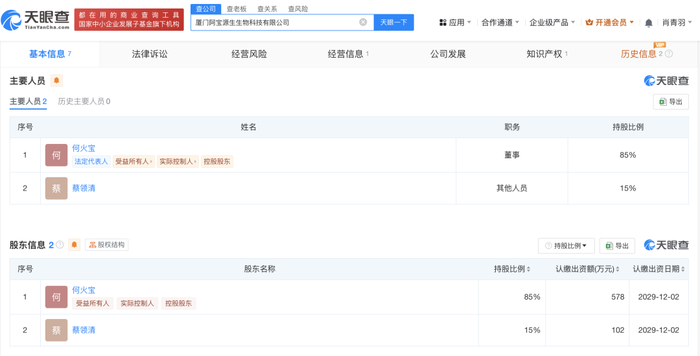第三方数据显示,6月3日至4日,啊宝某短视频平台账号涨粉273.43万,每日涨粉均超100万。天眼查App显示,何火宝(啊宝)名下关联1家公司,为厦门阿宝源生生物科技有限公司,该公司成立于2024年12月,由何火宝担任法定代表人、董事并持股85%,经营范围包括医学研究和试验发展、保健食品(预包装)销售、食品互联网销售(仅销售预包装食品)等。知识产权信息显示,今年4月,该公司已申请一枚何火宝个人形象图形商标,国际分类为啤酒饮料,当前商标状态为等待实质审查。