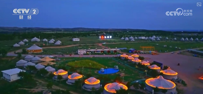 在九城宫景区,夏日“星空帐篷季”拉开帷幕。夜幕中,几十顶蒙古包错落有致地点缀在广阔的草原,游客们围着篝火起舞,一片欢声笑语。