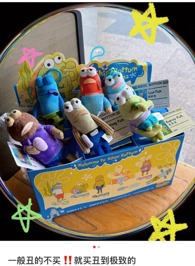 打工鱼、愣愣鱼、瘫瘫鱼、呆呆鱼、酷酷鱼.....在海绵宝宝和派大星等主角光环下,这些来自比奇堡没有姓名的“丑鱼”居民们却显得特别起来。作为泡泡玛特新推出的搞怪毛绒盲盒系列,记者看到,“丑鱼”们拥有凸出的眼睛和厚厚的瘪嘴,有的丑萌、有的呆板,散发出一种“淡淡的死感”,但正中年轻人下怀。