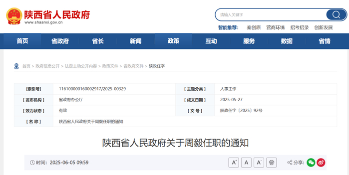 陕西省人民政府关于周毅任职的通知
