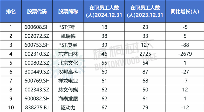 2024年末员工人数最少的十家A股上市公司分别为:*ST沪科(18人)、凯瑞德(38人)、*ST庚星(39人)、东方园林(46人)、北京文化(55人)、汉邦高科(60人)、祥龙电业(61人)、慈文传媒(62人)、海泰发展(62人)、驱动力(67人)。