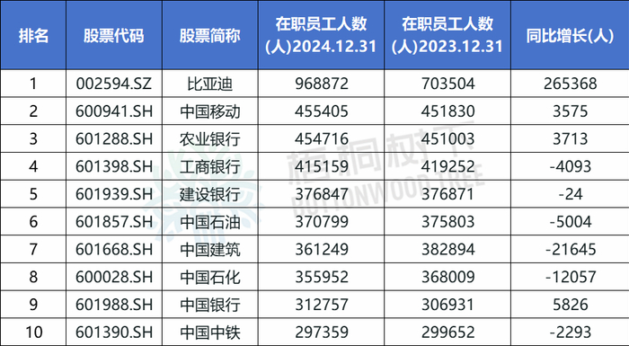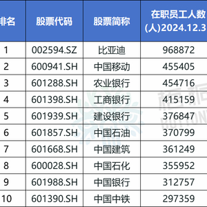 2024年末员工人数最多的前十家A股上市公司分别为:比亚迪(968872人)、中国移动(455405人)、农业银行(454716人)、工商银行(415159)、建设银行(376847人)、中国石油(370799人)、中国建筑(361249人)、中国石化(355952人)、中国银行(312757人)、中国中铁(297359人)。
