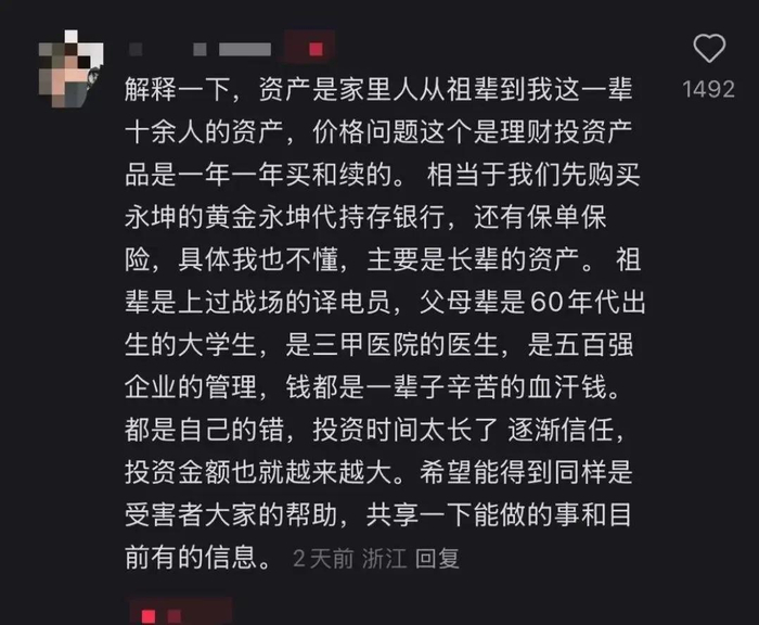 我也看了很多案例,基本上知道永坤黄金并且投资进去的,都是浙江的一些小老板,中产以上的圈层,大家熟人之间相互介绍。