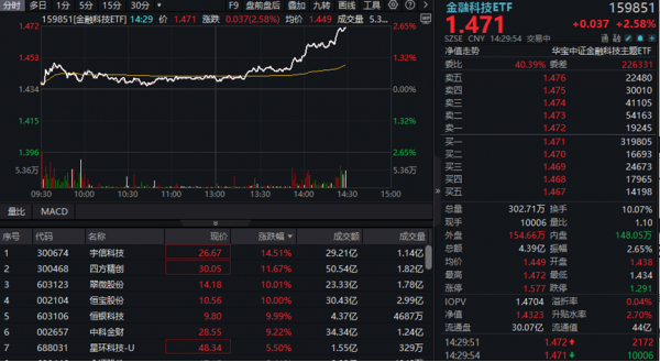 6月5日尾盘,稳定币概念股异动拉升,金融科技板块表现强劲,中证金融科技主题指数上涨2.14%,成份股方面,宇信科技领涨11.59%,四方精创大涨超10%,恒宝股份、翠微股份再次涨停斩获5天4板,恒银科技首板。热门ETF方面,$金融科技ETF(159851)场内价格上涨2.58%,成交额达4.39亿元。