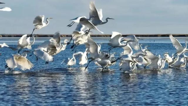 如今的东居延海水域面积达42 平方公里。沿河西岸,曾濒临枯死的柽柳得到抢救性保护;胡杨林面积从39万亩增至 44.41 万亩;草下伴生物种结构显著优化,原先占主导的苦豆、芦苇、碱草逐渐被甘草、芨芨草、沙拐枣等优良牧草取代。更令人欣喜的是,周边绝迹近十年的候鸟纷纷回归 —— 白天鹅重临故地,灰雁、黄鸭等鸟类在湖边形成稳定种群。越来越多的珍稀野生鸟类将居延海作为迁徙途中的重要驿站,每到迁徙季,数万只鸟儿集群栖息,蔚为壮观。目前,东居延海湿地鸟类已达 133 种,栖息候鸟超 10 万只,生物多样性显著提升。曾经因生态恶化而寸草不生、沙尘肆虐的周边区域,正逐步形成以天鹅、灰雁、黄鸭、大头鱼、芦苇等多种动植物共生的新型湿地生态系统。