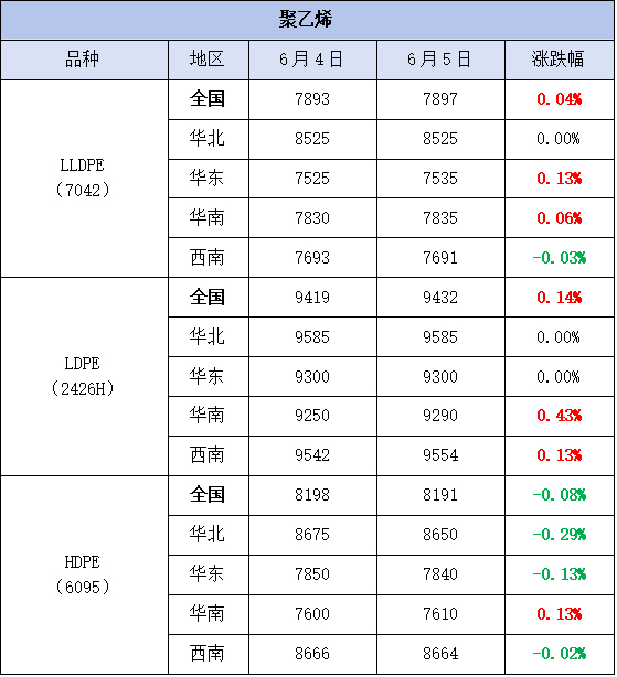 今日,聚乙烯市场窄幅波动,价格小幅涨跌。LLDPE(7042)市场价格为7897元/吨,较上一工作日上涨3元/吨,涨幅为0.03%;LDPE(2426H)市场价格为9432元/吨,较上一工作日上涨13元/吨,涨幅为0.14%;HDPE(6095)市场价格为8191元/吨,较上一工作日下跌7元/吨,跌幅为0.08%。沙特推动OPEC+加速增产以及美国汽油和馏分油库存增加,国际原油价格下跌,成本支撑减弱。在聚乙烯期货盘面震荡走强的带动下,部分现货市场报价意向跟涨。然下游需求跟进有限,采购刚需为主,市场心态谨慎,对价格形成拖累,价格呈现小幅涨跌。