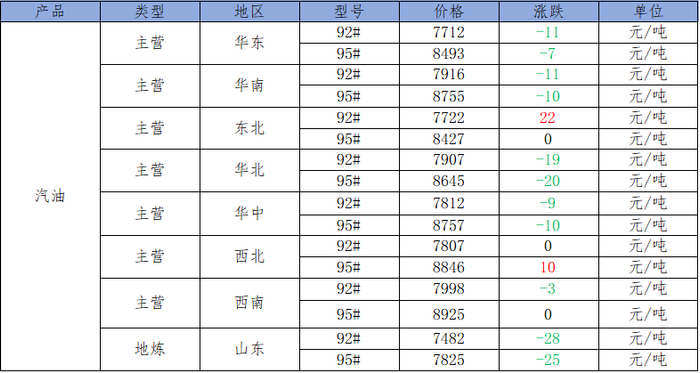 国内主营、地炼汽油价格
