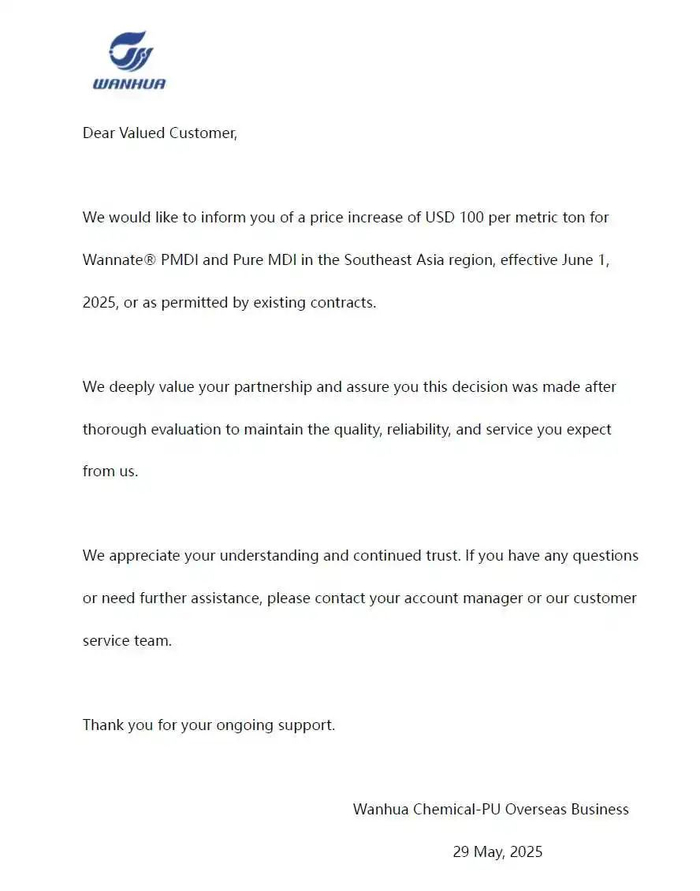 5月29日,市场获悉,自6月1日起,万华化学上调东南亚聚合MDI、纯MDI价格100美元/吨。