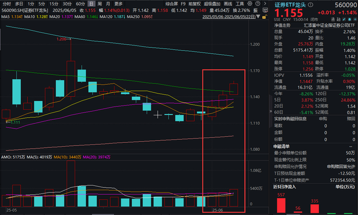 2025年6月5日,大盘午后涨势扩大,A股全天成交1.32万亿元,较昨日大幅放量近1400亿元,截至今日已连续30日成交额破万亿元。有行情,买证券!证券ETF龙头(560090)收涨1.14%,喜提三连阳。