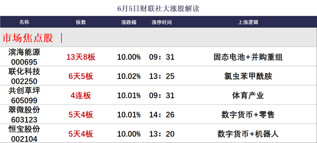 财联社6月5日讯,今日66股涨停,24股炸板,封板率为73%,共创草坪4连板,金陵体育20CM3连板,金时科技、菲林格尔、南华期货3连板,滨海能源13天8板,联化科技6天5板,翠微股份、恒宝股份5天4板。沪深两市全天成交额1.29万亿,较上个交易日放量1374亿。盘面上,市场热点较为杂乱,个股上涨和下跌家数基本相当。板块方面,CPO、足球概念、电力物联网、稳定币概念等板块涨幅居前,美容护理、食品加工、饮料制造、CRO等板块跌幅居前。截至收盘,沪指涨0.23%,深成指涨0.58%,创业板指涨1.17%。