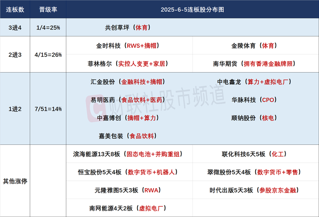 正在进行的江苏省城市足球联赛持续火爆,在“苏超”的带动下,各地文旅部门纷纷推出观赛旅游套餐、城市IP展演,将赛事流量转化为文旅增量。6月2日至6月8日,江苏省内景区预订同比增长305%。足球概念为首的体育产业链持续站上风口,前排核心共创草坪、金陵体育双双实现连板晋级,进而带动舒华体育、康力源等众多低位股展开大面积补涨。不过整个大消费产业链今日受到港股众多消费人气股集体大跌拖累,全天表现低迷,其中黄金珠宝、IP文创、美容日化等方向跌势尤为惨烈,板块内持续走出强趋势个股的批量瓦解仍对板块情绪构成较大杀伤。在整个消费股今日迎来大面积补跌后,明日修复的概率不低,而体育概念由于其本身的自带流量属性以及作为少数几个与港股方面相关度较低的分支,仍容易成为短线活跃资金绕不开的方向。