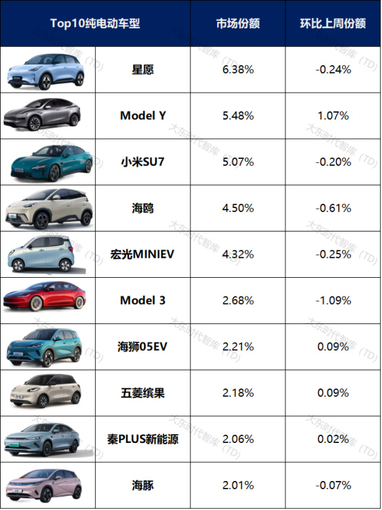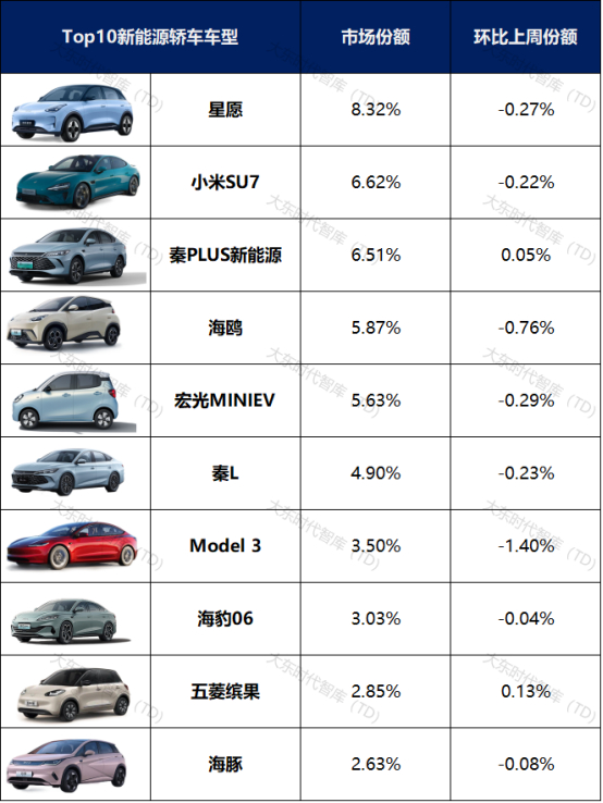 CR3、CR5和CR10分别为21.45%、32.94%、49.84%。星愿和小米SU7蝉联冠亚军之位,星愿本周占比8.32%,环比下滑0.27%;小米SU7本周占比6.62%,环比下滑0.22%。秦PLUS新能源本周排名上移三位至第三名,占比6.51%。整个榜单前十的车型中,比亚迪品牌车型占半数,共5款车型上榜,合计占比达22.93%。