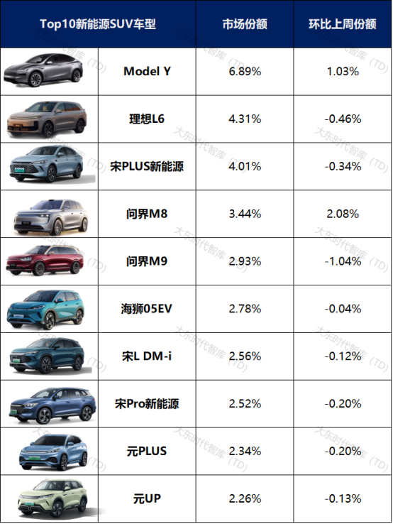 CR3、CR5和CR10分别为15.21%、21.58%和34.04%。前三车型未发生变化:Model Y占比6.89%,位居榜首;亚军为理想L6,占比4.31%;排名第三的则为宋PLUS新能源,市占率为4.01%。排名第四的是问界M8,为本周新上榜车型,市占率为3.44%,环比增加2.08%,而上周榜单垫底的理想L7本周遗憾落榜。