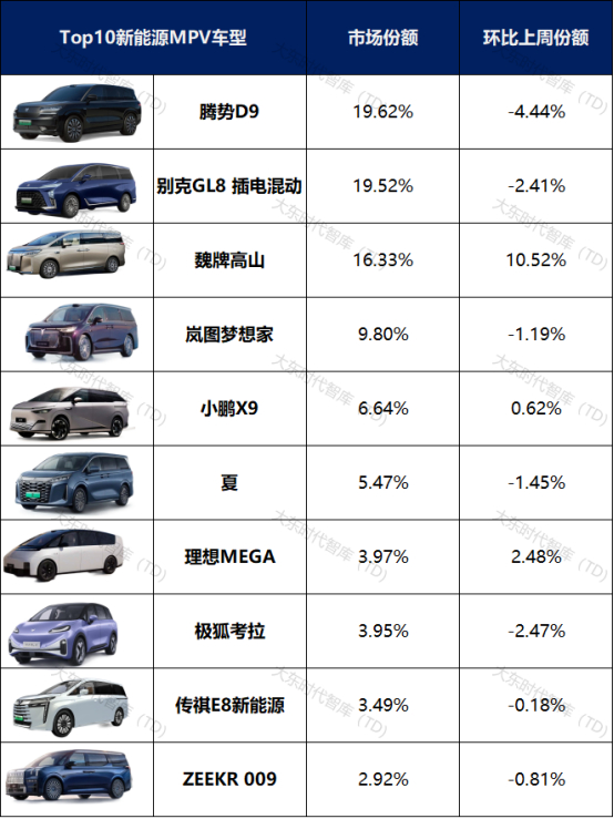 在21周新能源乘用车中,MPV车型仅占4.19%。销量排名前十的MPV车型分别为腾势D9、别克GL8 插电混动、魏牌高山、岚图梦想家、小鹏X9、夏、理想MEGA、极狐考拉、传祺E8新能源和ZEEKR 009。