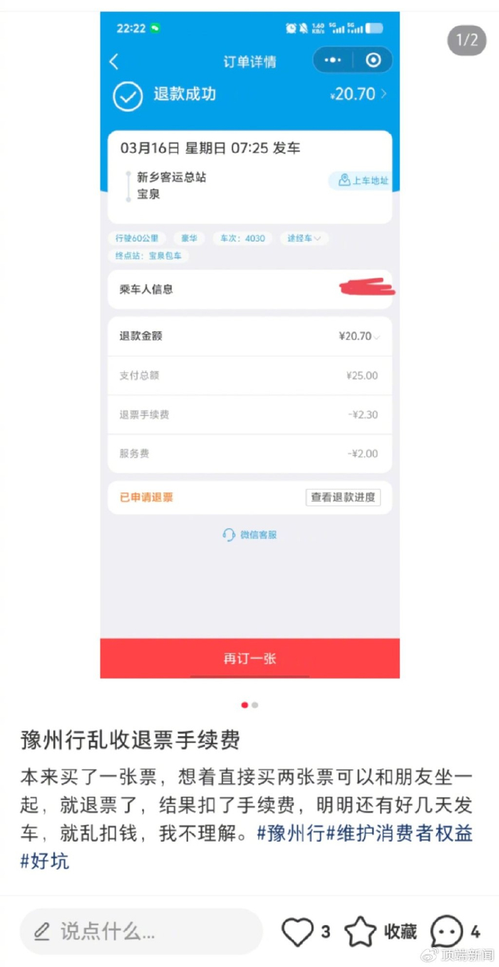 “网络购票为企业减少了场地、人员及耗材投入,降低了成本,为啥还要另外收费?”近日,顶端新闻记者从社交平台看到,有多名乘客发帖质疑豫州行收取购票服务费、退票手续费的合理性。