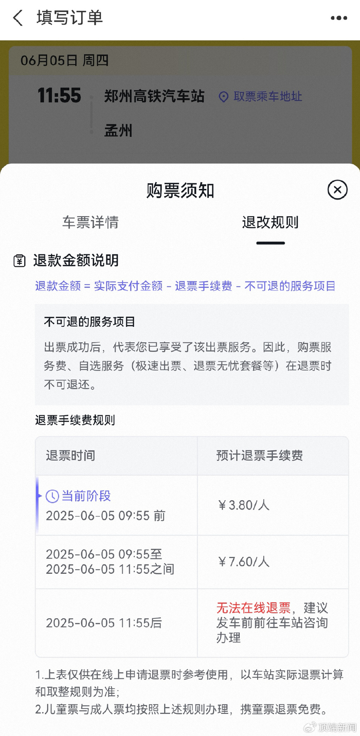 购票须知中说明,发车时间两个小时前预计退票手续费3.8元/人,发车时间两个小时内则为7.6元/人,退款金额=实际支付金额-退票手续费-不可退的服务项目。顶端新闻记者计算后得出,如购票人在发车时间两个小时前退票,每张票会被扣去3.8元手续费与3元服务费,共计扣除6.8元。