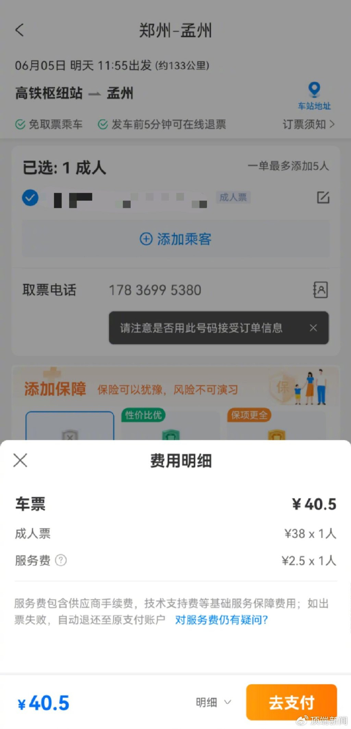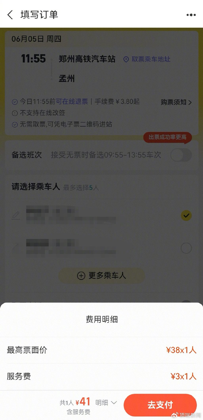 在飞猪购票页面,顶端新闻记者看到,同一班次车票乘客实际应支付41元,其中包含38元/人的票面价格与3元/人的服务费。