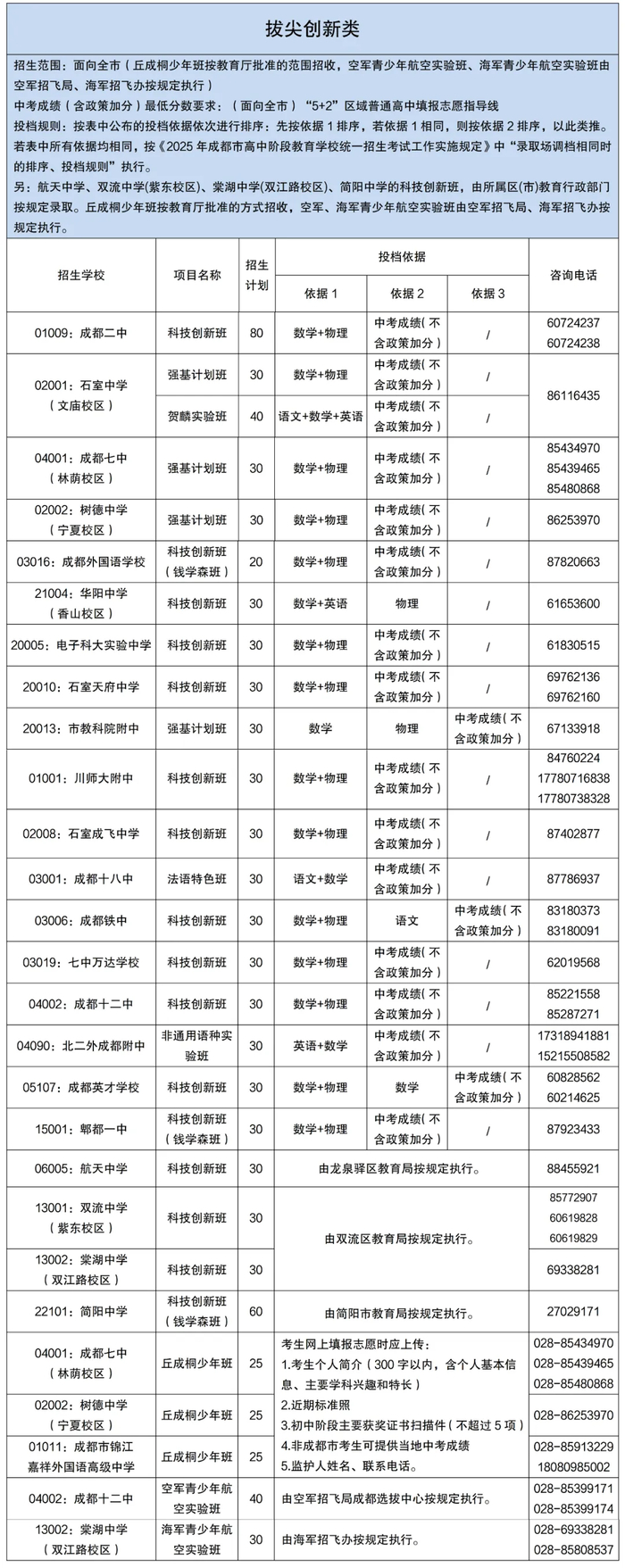 据悉,成都市普通高中项目班分为2种类型。一是拔尖创新类,包括科技创新班、强基计划班、人文实验班等。今年共有23所学校设置28个班,面向成都市内招生(丘成桐少年班和空军、海军青少年航空实验班除外)。二是特长特色类,分为艺体类和非艺体类。今年共有27所学校设置33个班,面向成都市内招生(七中万达学校足球预备队除外)。