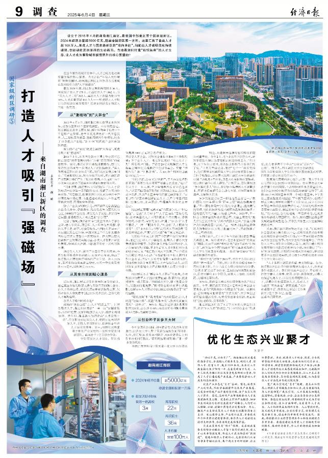 设立于2015年4月的湖南湘江新区,是我国中部地区首个国家级新区。2024年经济总量超5000亿元,稳居全国新区第一方阵。这里汇集了各类人才超100万人,形成人才与国家级新区的“双向奔赴”,勾勒出人才磁吸效应持续增强、创新动能更加澎湃的生动画面。当地是如何打造“近悦远来”的人才生态,让人才成为驱动城市能级跃升的核心变量的?