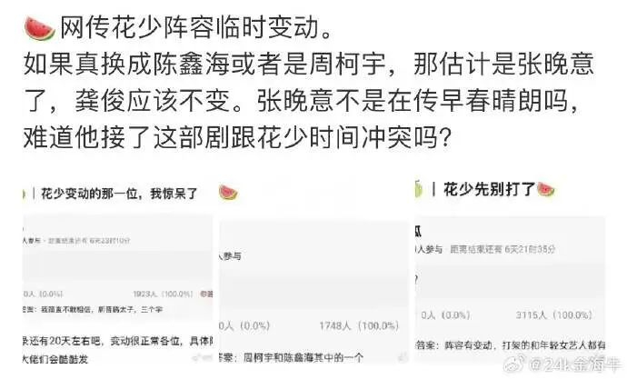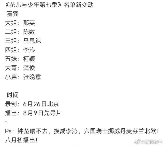 6月5日,#花少阵容临时变动#冲上热搜,在人员方面,网传张晚意因主演新剧《早春晴朗》档期冲突面临退出风险,替代人选包括陈鑫海、周柯宇。部分爆料称节目组调整与其和龚俊粉丝间的矛盾有关。但陈鑫海、周柯宇团队已辟谣参与录制,周柯宇因《战至巅峰4》行程冲突或难协调时间。还有消息称钟楚曦原本可能在阵容中,后换成了李沁。