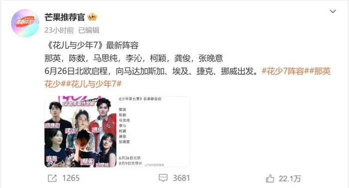 6月4日“芒果推荐官”发布微博,公布了《花儿与少年7》最新阵容名单,分别是:那英、陈数、马思纯、李沁、柯颖、龚俊、张晚意。