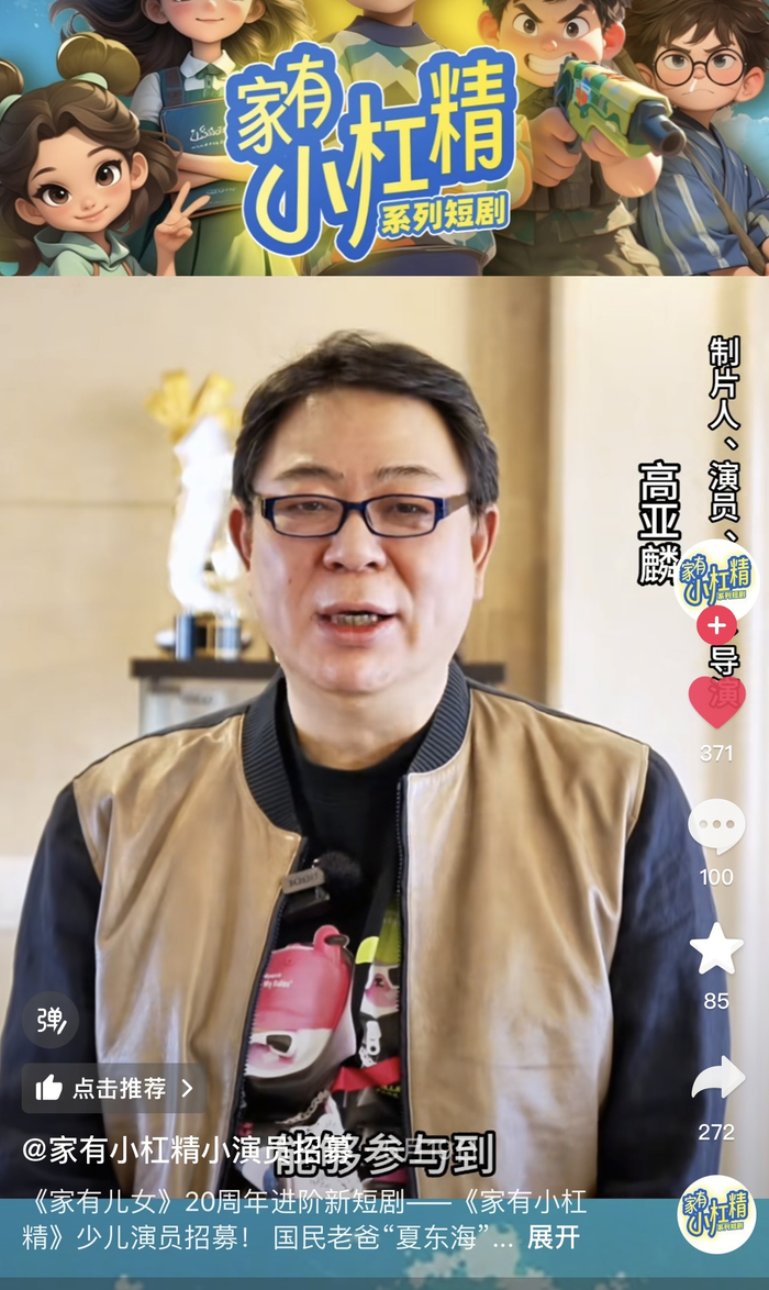 据演员高亚麟(《家有儿女》中饰演爸爸“夏东海”)、孙桂田(饰演慈祥“姥姥”)、尤浩然(饰演可爱小弟“夏雨”)等现身发布会透露,新项目《家有小杠精》已进入筹备阶段,高亚麟更是通过抖音平台发布小演员招募视频,这意味着,阔别荧屏多年的“重组家庭”将以全新面貌在短剧领域与观众重逢。