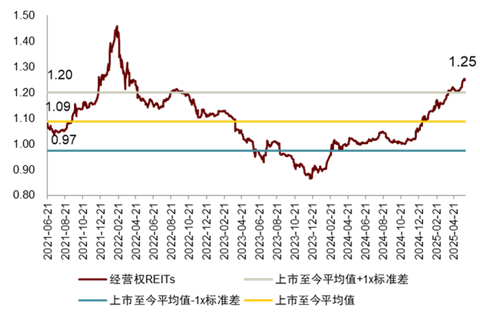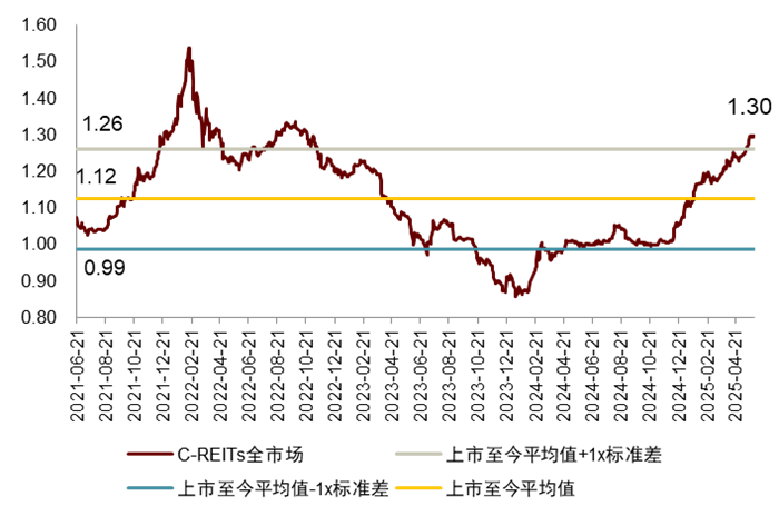 注:1)数据截至2025年5月30日,数据频率为月度;2)取各REITs最新披露的账面价值测算P/B
