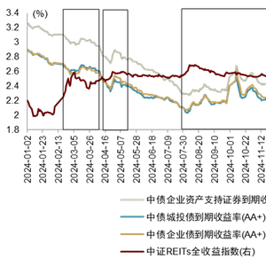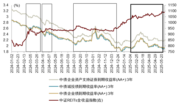 图表1:中证REITs全收益指数在本轮信用债收益率先上后下期间保持高位震荡偏强