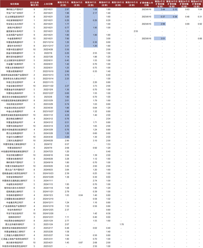 注:1)数据截至2025年5月30日;2)蓝色为已解禁份额 资料来源:REITs基金发售公告,中金公司研究部